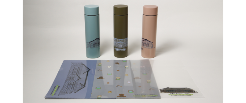 現在ミュージアムでは、来館者10万人達成を記念して、オリジナルデザインの限定グッズを受付にて販売しております。ミュージアムの建物がデザインされたステンレスボトル(全4色・1本3,000円[税込])や、 当館キャラクター「いこまるちゃん」や建物外観をデザインしたクリアファイル(全3種・1枚200円[税込])をご用意しております。興味のある方は、ぜひ受付までお声がけください。